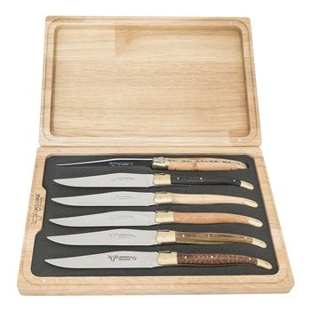 | Beskrivning | Exklusiva stekknivar med vackra handtag i akacia, enbär, olivträ, pistage, ebenholts och trädljung, utmärkta till framför allt kött. Varje kniv tillverkas helt för hand i Laguiole, Frankrike, och ryggen på handtaget pryds av ett mönster, unikt för hantverkaren som står bakom verket, samt Laguiole en Aubracs ikoniska bi. Eftersom trä är ett levande material kan skiftningar i färg förekomma. Sa¨ljs i 6-pack. Laguioles bestick håller otroligt hög kvalitet och Laguiole lämnar därför livstidsgaranti på alla sina produkter. Besticken kommer i en lyxig trälåda, vilket gör dem till en perfekt present. |